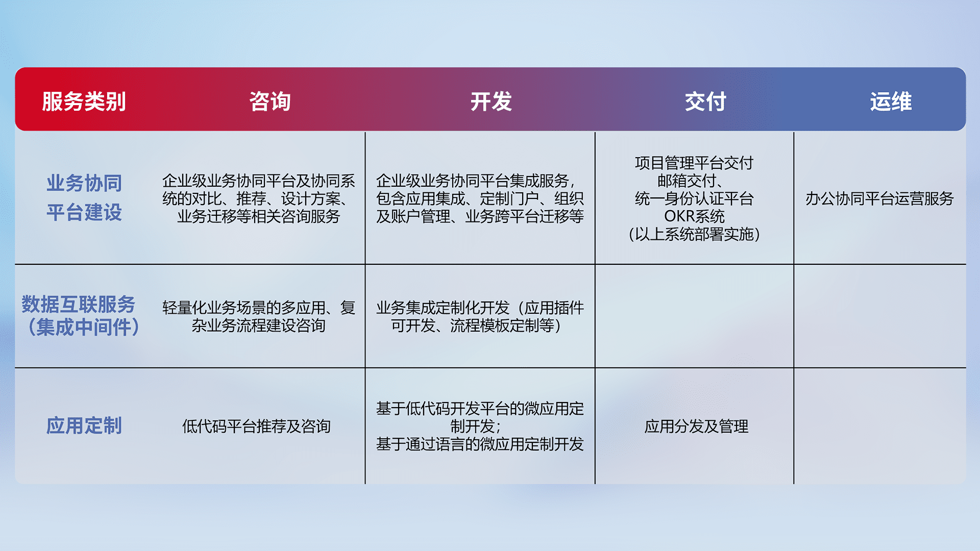 针对钉钉、、企微、、、IDaas等平台级产品提供产品的规划、、、、方案、、、交付、、定制化开发等服务,,,实现如统一协同办公、、智能客户服务、、、、混合会议管理、、智能数据查询、、、等业务场景,,实现数字化转型。。。