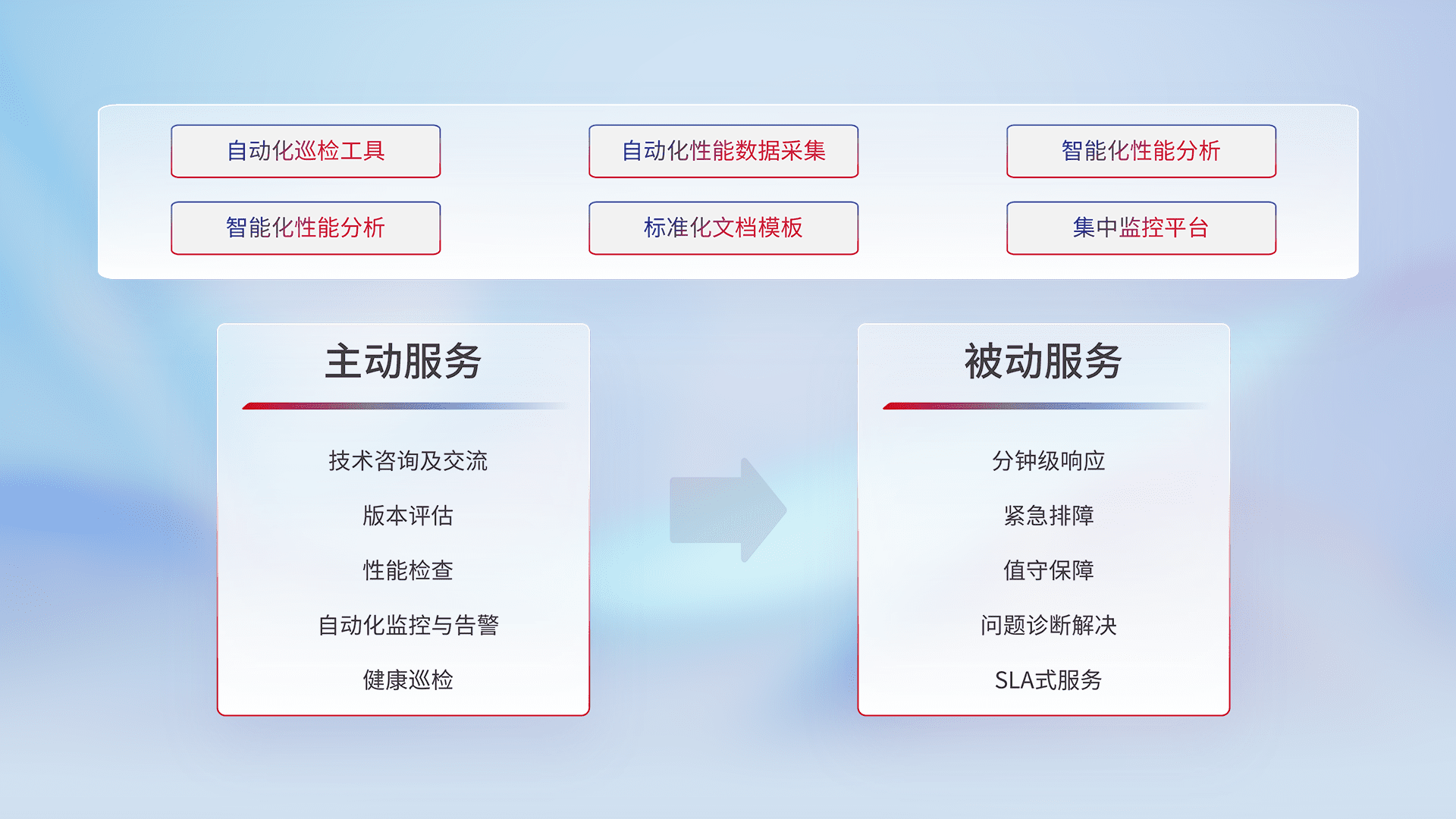 智能化工具和标准化文档,,,保障服务质量,,,,提供主动服务(包含技术咨询、、版本评估、、、、性能检查、、自动化监控与告警、、健康巡检)和被动服务包含(分钟级响应、、紧急排障、、值守保障、、、问题诊断解决、、、SLA服务)。。
